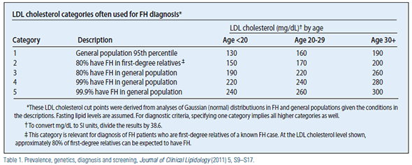 Diagnosis of FH: For children, adolescents, and young adults (< 20 years) FH may be suspected when the LDL cholesterol is 160 mg/dL or non-HDL cholesterol is 190 mg/dL. A follow-up lipid profile should be obtained after appropriate dietary changes, especially in borderline cases, to more accurately assess the mean result. Formal clinical diagnosis of FH can be made by applying any one of several validated sets of criteria [U.S. Make Early Diagnosis Prevent Early Death (MEDPED), Dutch Lipid Clinic Network, Simon-Broome Registry]. It should be noted that LDL cholesterol cut points usually vary with age (Table 1)