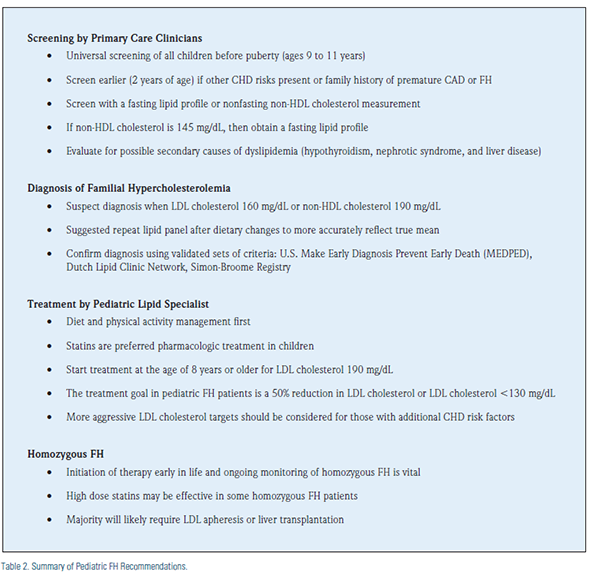Screening: Universal lipid screening for all children is recommended between ages 9 to 11.1,2,3 Previous guidelines had recommended only screening for cholesterol if there was a clear family history of FH or premature CHD.