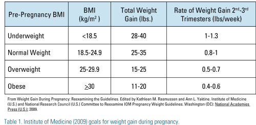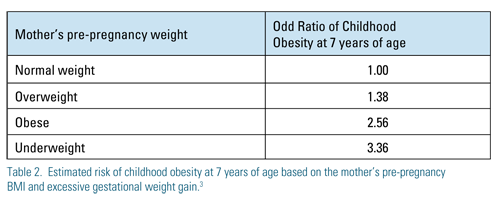 The mother’s pre-pregnancy weight has consistently been shown to be a strong predictor of childhood obesity.1 There was a 3.6 times increased risk among 2- to 14-year-olds whose mothers were obese (BMI > 30) prior to pregnancy versus those who were not obese (BMI < 25). Recommended weight gain during pregnancy is shown in Table 1.